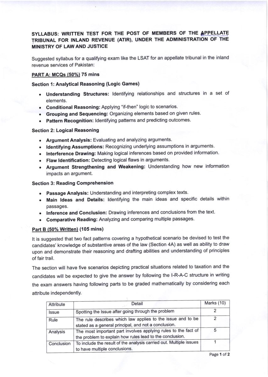 THE WRITTEN TEST FOR THE POST OF MEMBER OF THE APPELLATE TRIBUNAL FOR INLAND REVENUE (ATIR) WILL BE HELD ON 8TH OF DECEMBER, 2024 AT THE NATIONAL UNIVERSITY OF SCIENCE & TECHNOLOGY (NUST) EXAM CENTER GATE NO.04, SECTOR H-12, ISLAMABAD