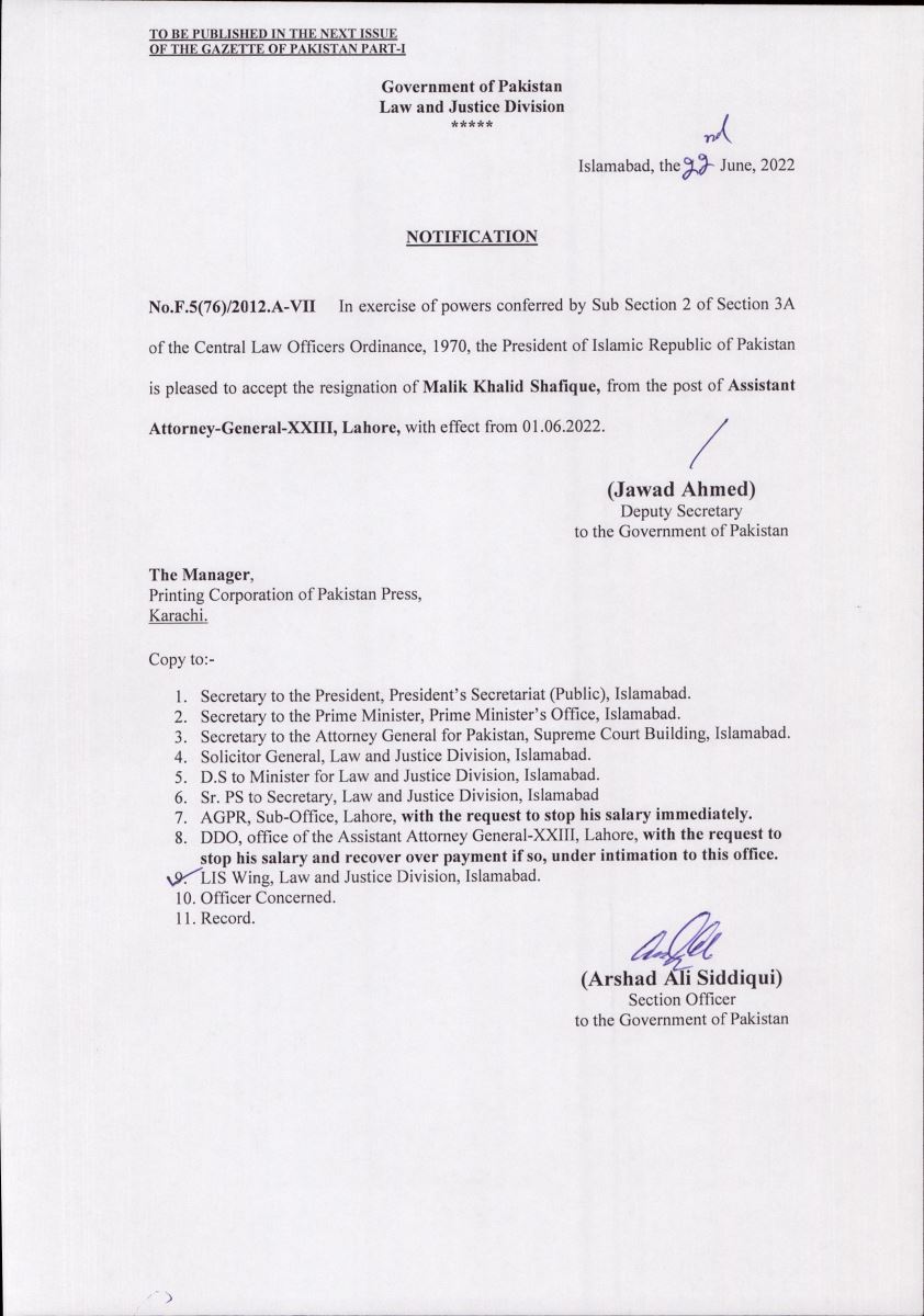 ACCEPT THE RESIGNATION OF MALIK KHALID SHAFIQUE FROM THE POST OF ASSISTANT ATTORNEY GENERAL-XXIII, LAHORE