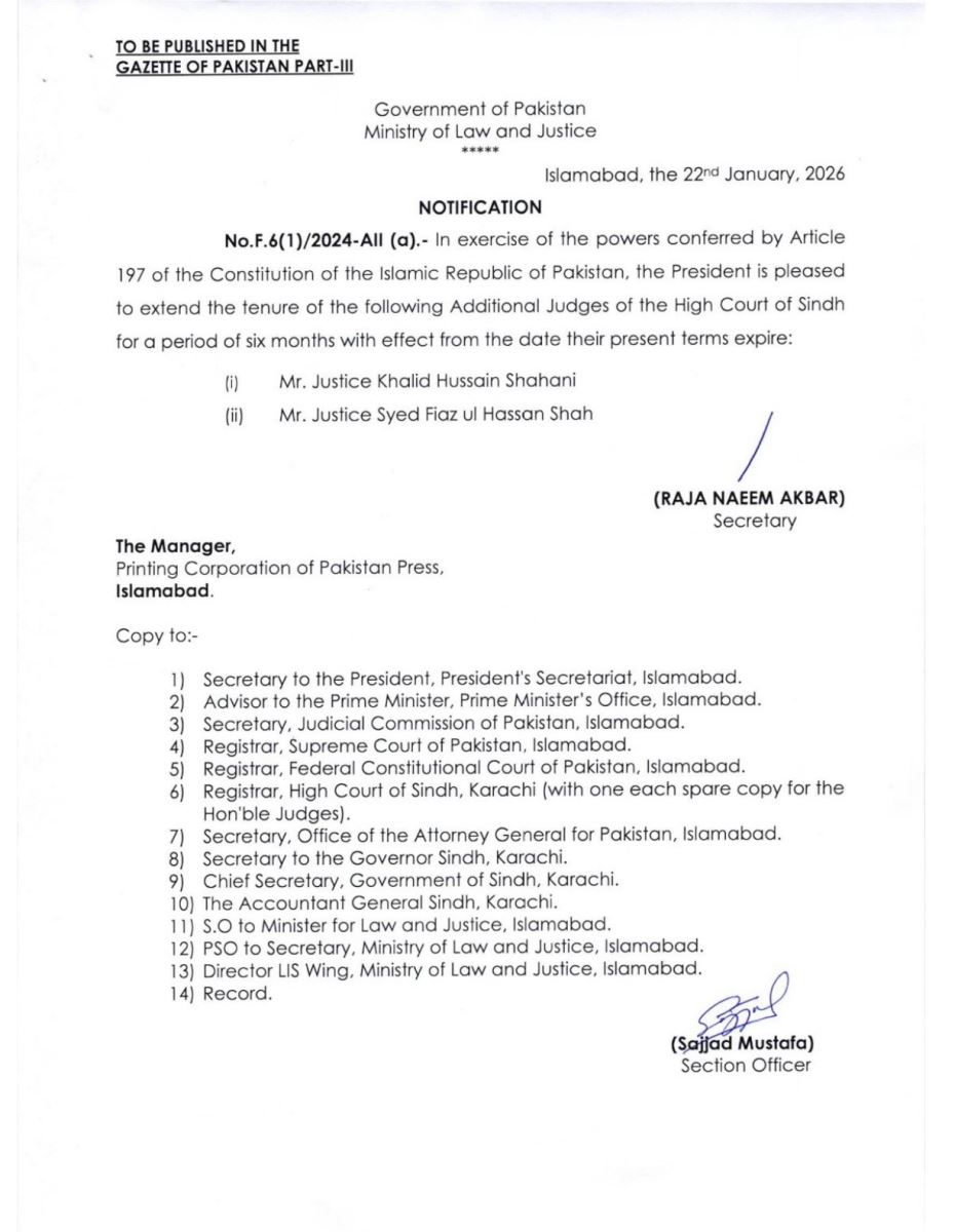 EXTEND THE TENURE OF THE FOLLOWING ADDITIONAL JUDGES OF THE SINDH HIGH COURT, SINDH