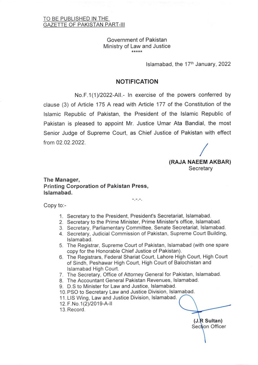 APPOINTMENT OF MR. JUSTICE UMAR ATA BANDIAL AS CHIEF JUSTICE OF PAKISTAN