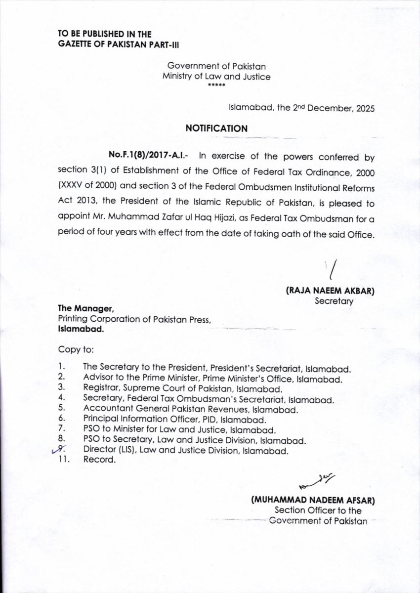 APPOINTMENT OF MR. MUHAMMAD ZAFAR UL HAQ HIJAZI, AS FEDERAL TAX OMBUDSMAN.