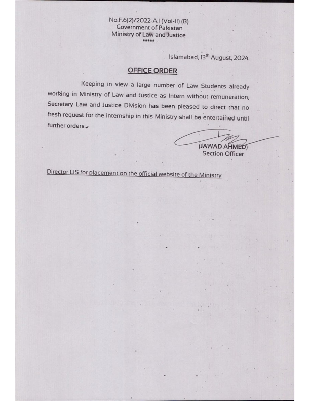 OFFICE ORDER (REGARDING INTERNSHIP AT MINISTRY OF LAW AND JUSTICE)