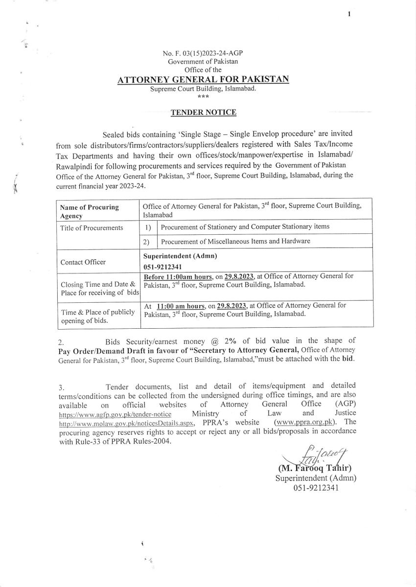 TENDER NOTICE OFFICE OF THE ATTORNEY GENERAL FOR PAKISTAN 2023-2024